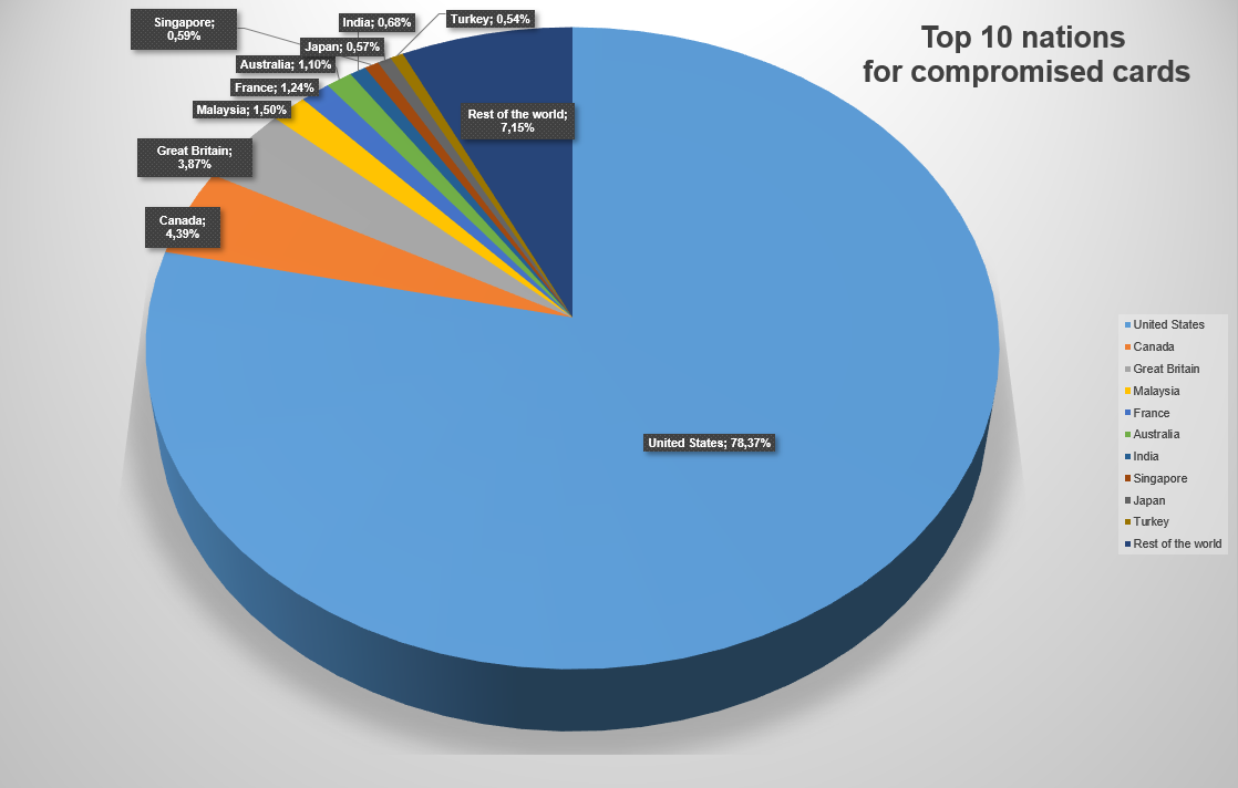 This value matches with another investigation conducted In January 2023 by the researchers from Recorded Future’s Insikt Group, which reported that of the 60 million compromised payment card records for sale on dark web platforms in 2022, 70% were issued by financial institutions in the USA [2].