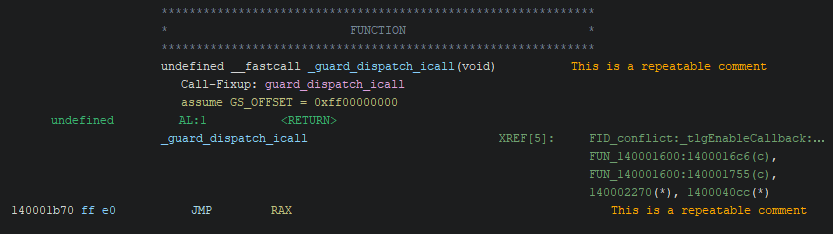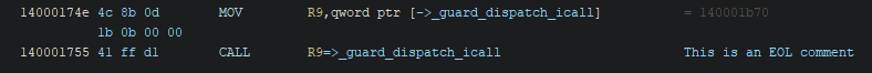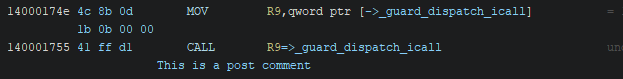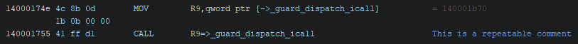 The repeatable comment requires a bit more clarification, as it can be somewhat confusing. A repeatable comment is set in one place, after which it shows up at all cross references. This allows you to annotate a given address, and import the comment into other locations automatically. In the image below, the comment is set.