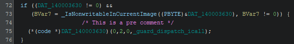 Before diving into the different comment types, it is important to note that some comments do not show up on the location where they are entered. A prime example of this are conditions within the decompiled code, such as an if-statement. The reason as to why these comments aren’t added at the exact location where they are entered in the decompiler, is because the decompiled code is created based on nodes, and a comment is added to a node (which references an address). Do not think of the decompiled code as a line-by-line text, but rather as a tree with nodes.