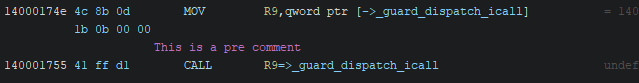 The pre comment functions like the post comment, but puts the comment before the given address. This is the only comment to also show up in the decompiler view.