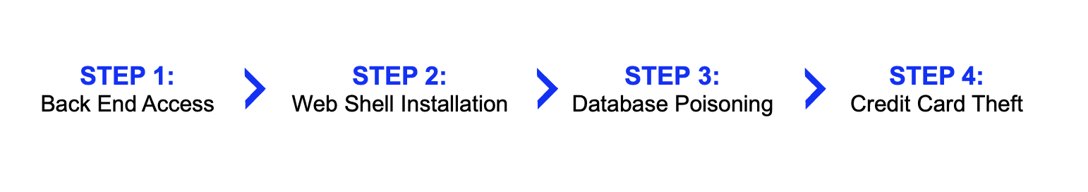 This section will delve into the technique reconstructed by the team whereby the attacker managed to insert malicious JavaScript code inside the back-end of an e-commerce site. The strategy used is developed through several steps, each of them allows the attacker to gradually gain more and more control over the site and the server hosting the back-end, until the final goal of exfiltrating sensitive data is achieved.