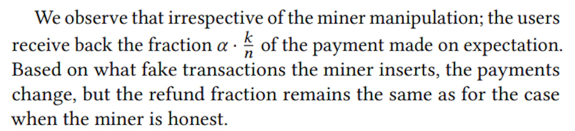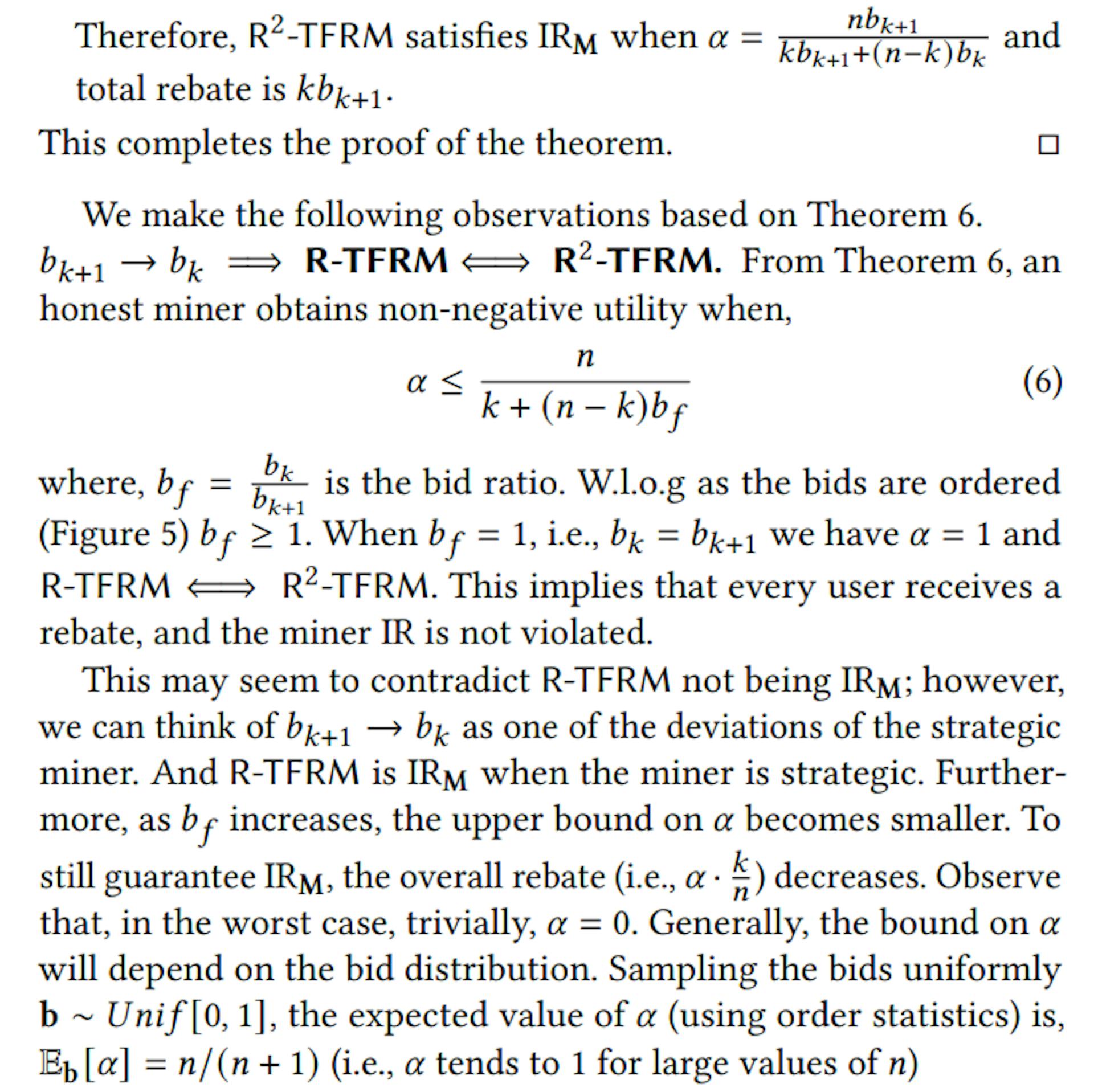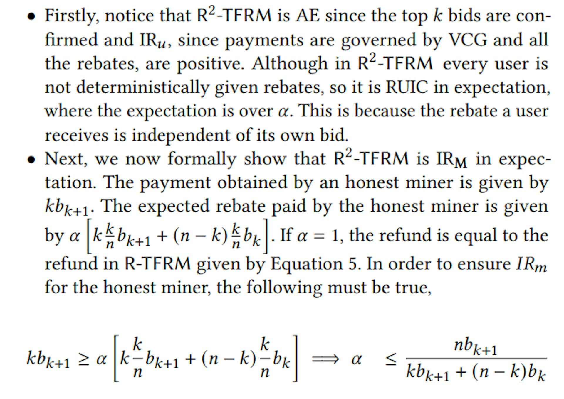 Future Work. Future directions can explore TFRMs with randomized rebate functions, which may likely satisfy stronger notions of IC and IR. Another approach may be to explore non-linear rebate functions, which may provide a better redistribution index on average. In addition, unlike this work, future work can also explore transactions with varying sizes.