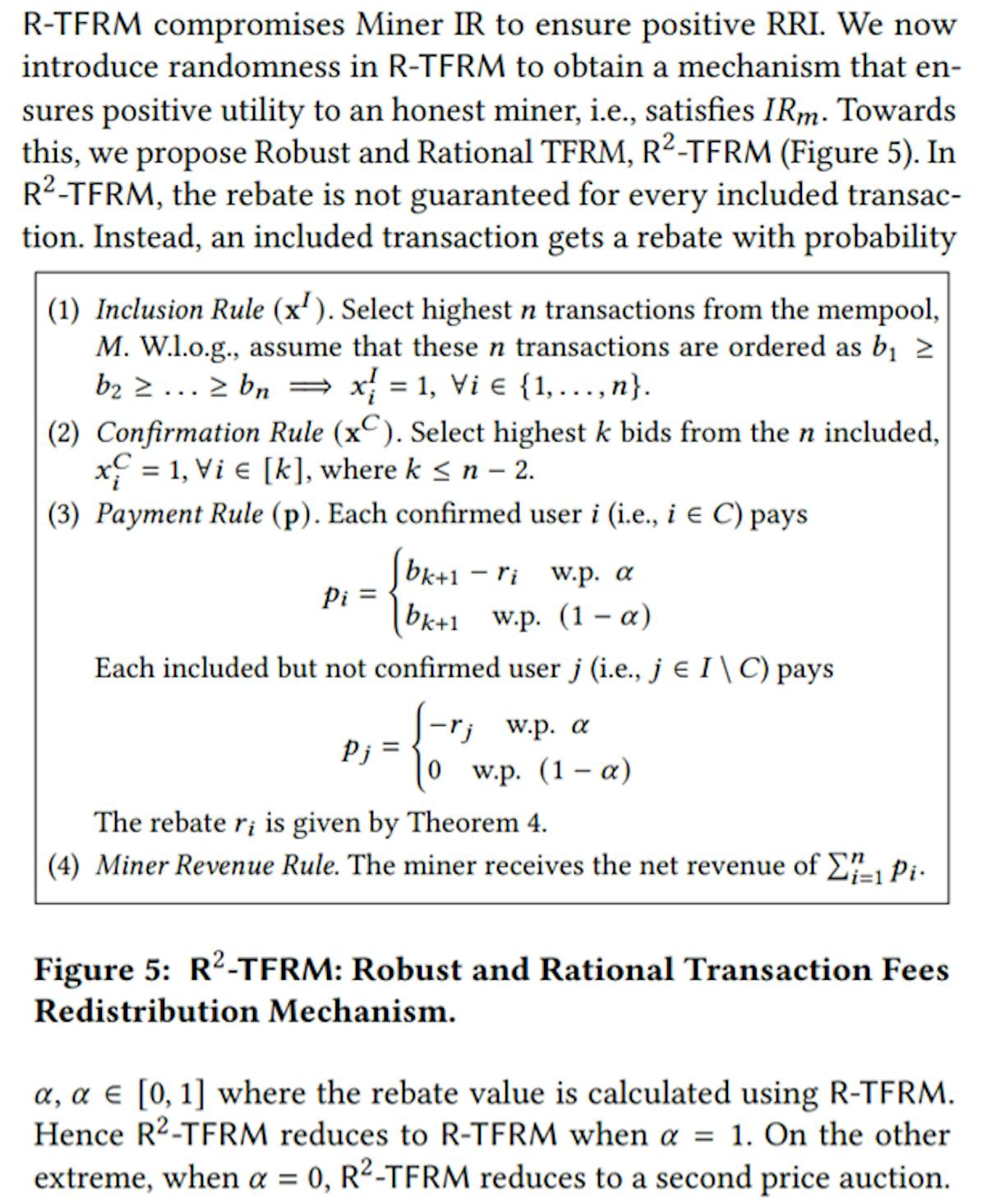 R2 -TFRM: On-chain Randomness. As stated, each transaction receives a rebate with a probability 𝛼. Similar to other TFMs [8], we employ trusted on-chain randomness for this randomization. Researchers have proposed such trusted randomized protocols using various cryptographic primitives [3, 10]. Significantly, the miner of the block cannot exert any influence on this randomization.