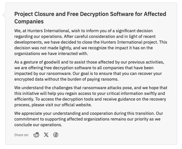 “After careful consideration and in light of recent developments, we have decided to close the Hunters International project,” the hackers wrote in a post, without clarifying what specific developments it was referring to. “This decision was not made lightly, and we recognize the impact it has on the organizations we have interacted with.”