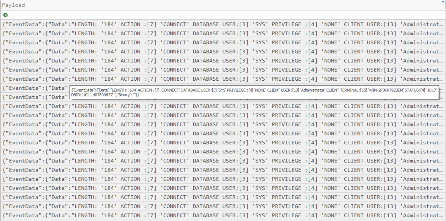 {“EventData”:{“Data”:”LENGTH: ‘183’ ACTION :[7] ‘CONNECT’ DATABASE USER:[3] ‘SYS’ PRIVILEGE :[6]
