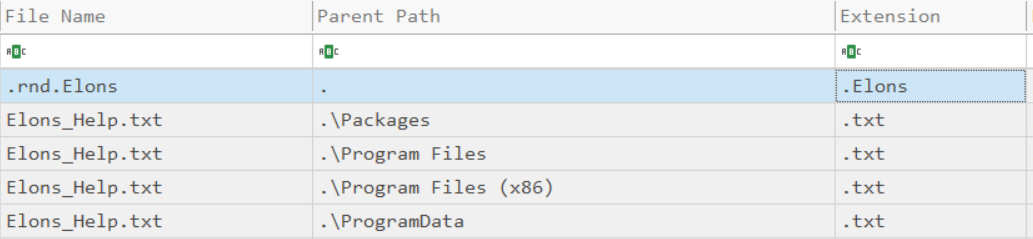 And subsequently, the evidence of the first encrypted file followed, i.e. “.rnd.Elons”, in the path “C:\”, as visible in the figure below.