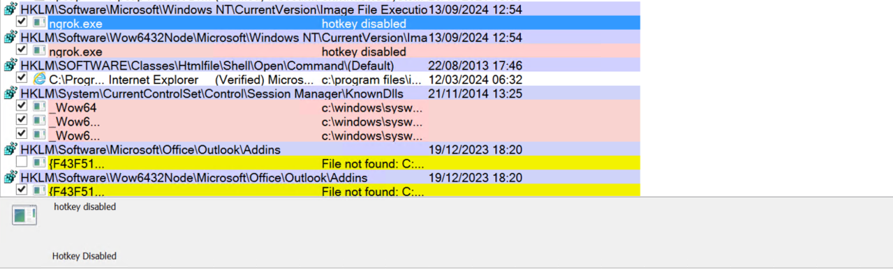 In fact, it was possible to notice, within the following screenshot, obtained directly in live analysis during the investigation of the compromised database server, the presence of Ngrok within the Autostart locations (i.e. among the executables that run at system startup with the parameters indicated in their specific command line) and, in this case, it is evident that the command line of the process had been replaced by the wording “Hotkey Disabled”.