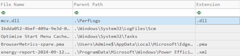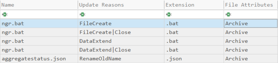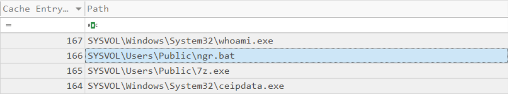 Although it was not possible to analyze the file, evidence of its execution was detected from the path “C:\Users\Public\ngr.bat”, highlighted in the following figure, which can be contextualized within this time interval even if it does not have the exact timestamp due to the nature of the artifact from which it was obtained and in correlation with the short stay of the file within the server.