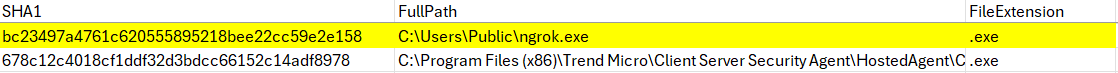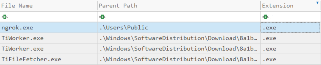 Then, the creation of the Ngrok executable in the path “C:\Users\Public\ngrok.exe” was also noted, as visible in the following figure, which suggested a direct link between the “ngr.bat” file and the “ngrok.exe” executable.