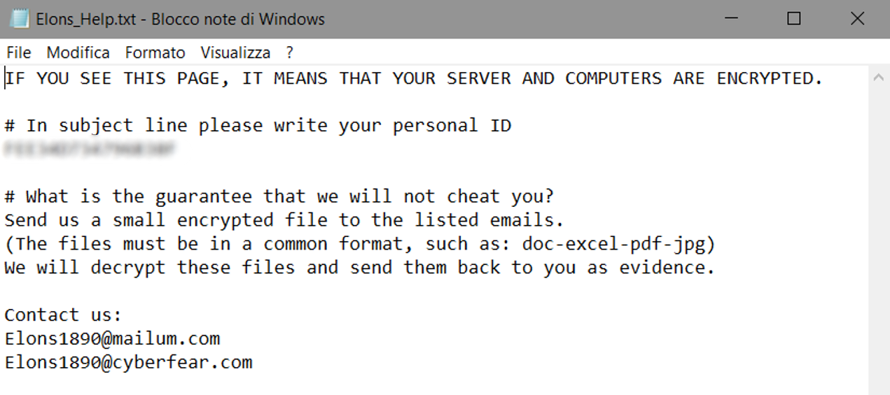 In fact, in an analysis of the “mother” Blackshadow ransomware (probably born in January 2023) carried out by the company F.A.C.C.T. (at this link: https://www.facct.ru/blog/blackshadow/), the Elon variant was not yet present among the subfamilies identified by the F.A.C.C.T. company.