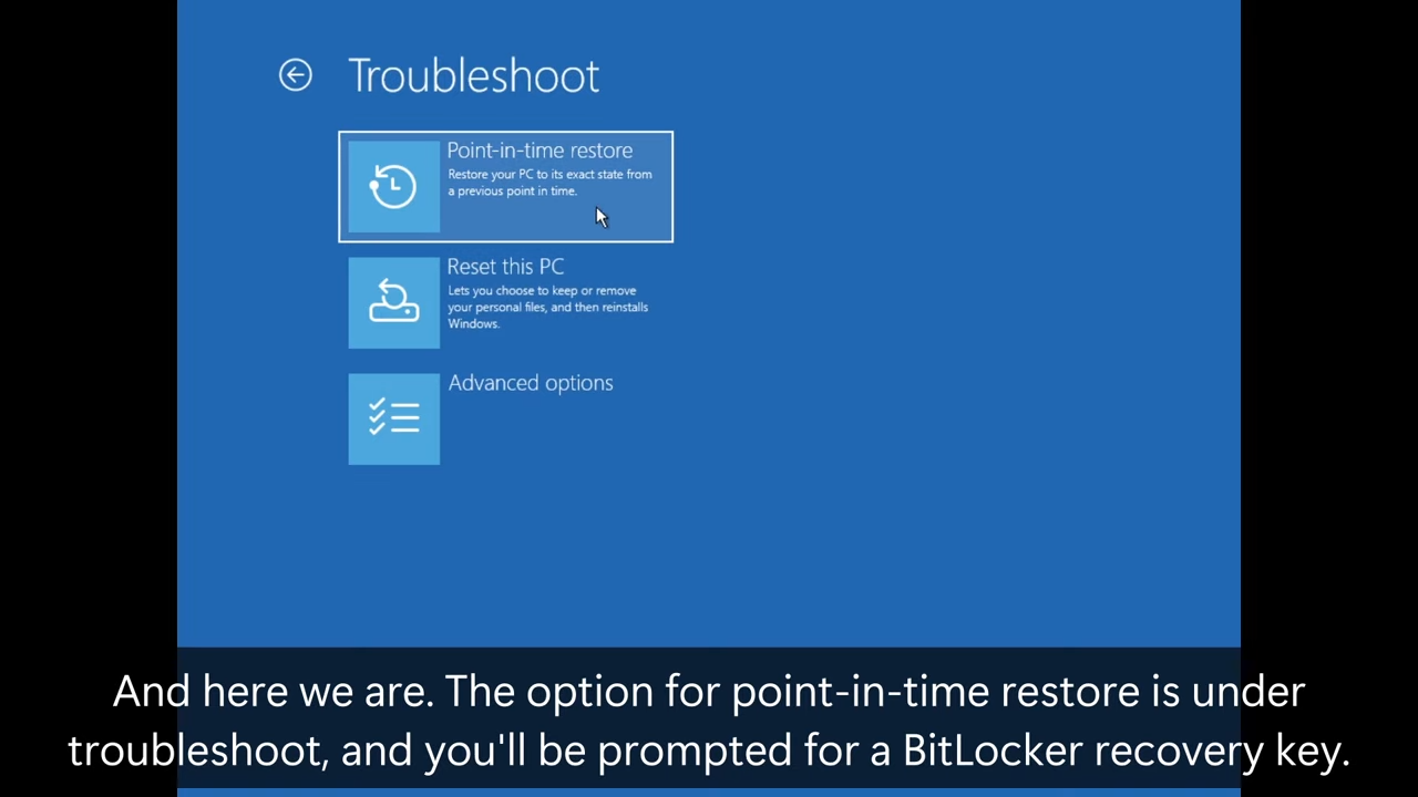 当发生崩溃后进入 WinRE 高级启动界面,选择疑难解答、时间点还原、然后选择对应的时间即可,启动后系统需要几分钟或十几分钟进行还原处理,还原后系统就会进入快照创建时的状态。