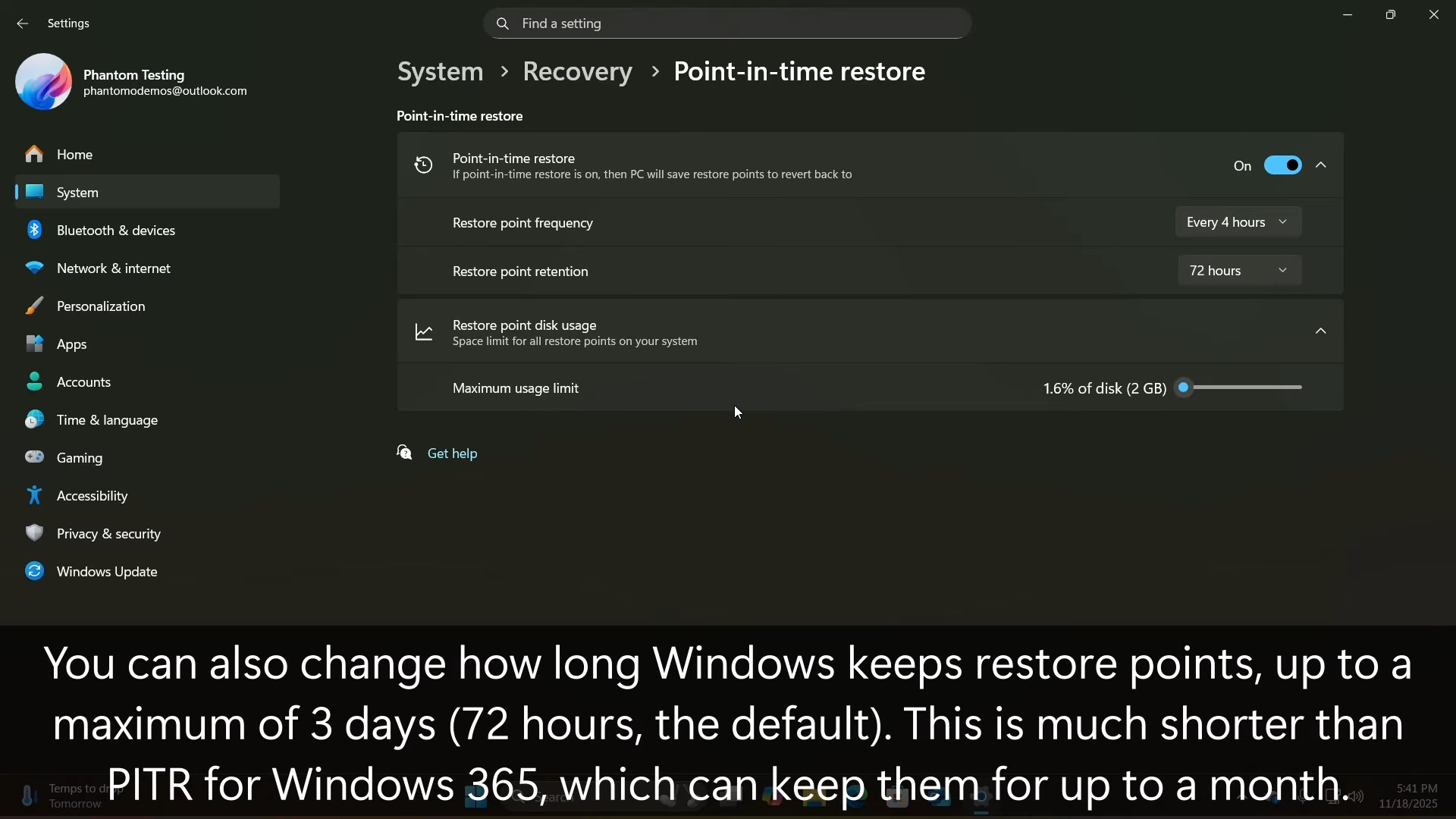 该功能位于 Windows 11、设置、系统、恢复、时间点还原,此功能默认情况下开启并且设置为每 24 小时拍摄快照并保留 72 小时,默认情况下系统会保留三张快照供用户恢复。