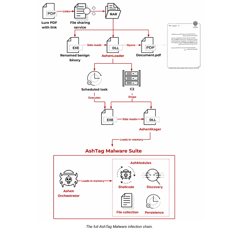 The attack chains commence with a harmless PDF decoy that tricks recipients into downloading a RAR archive from a file-sharing service. Opening the archive triggers a chain of events that results in the deployment of AshTag.