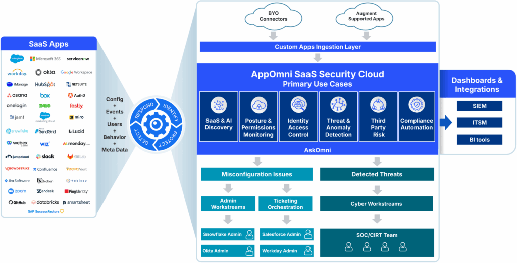 AppOmni integrates seamlessly with SIEM, SOAR, XDR, IAM, UEBA, and ticketing platforms, including: