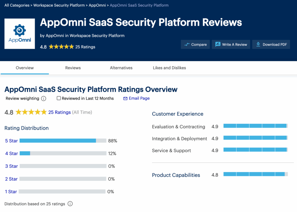 Gartner Peer Insights Reviews: 4.8 stars out of 5 on https://www.gartner.com/reviews/market/workspace-security-platform/vendor/appomni/product/appomni-saas-security-platform