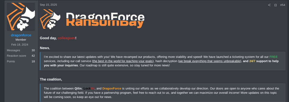 The post published on September 15, identified on a Russian underground forum and posted by the user “dragonforce”, announced the creation of the Qilin/LockBit/DragonForce ransomware cartel.