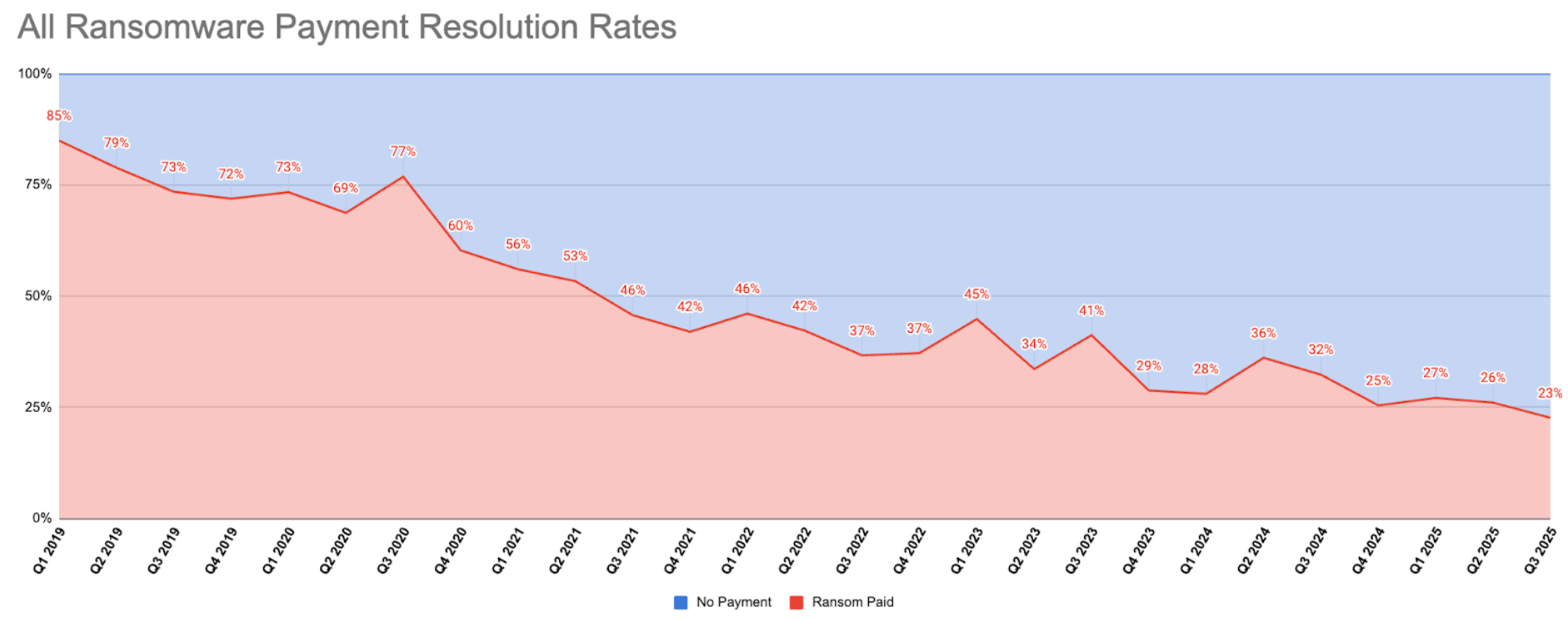Figure 2. Source: Coveware https://www.coveware.com/blog/2025/10/24/insider-threats-loom-while-ransom-payment-rates-plummet