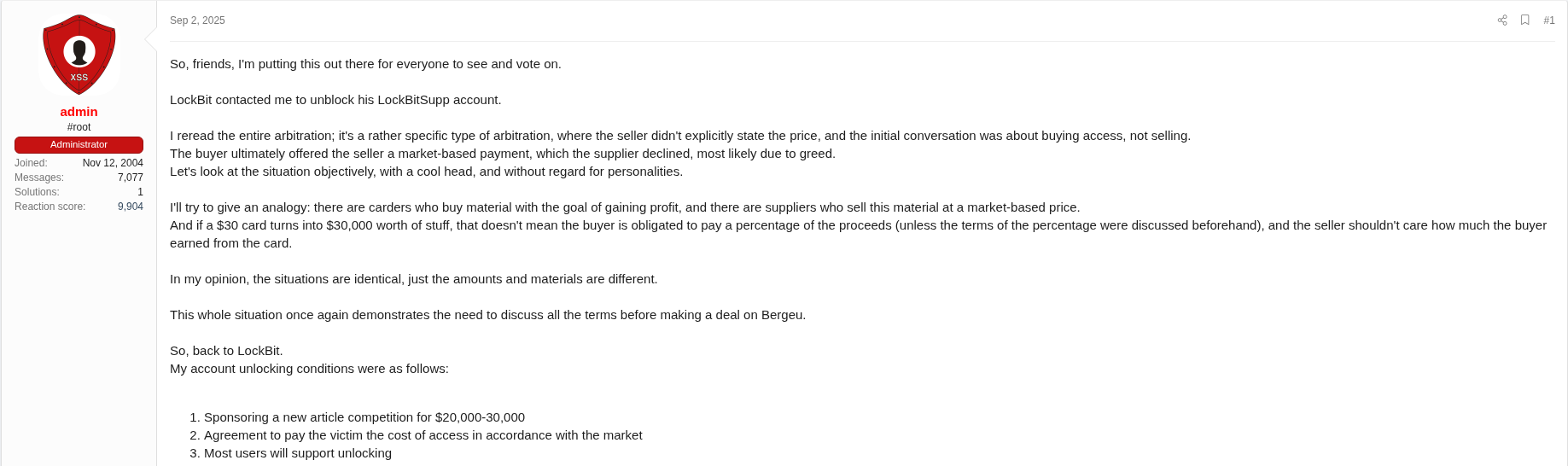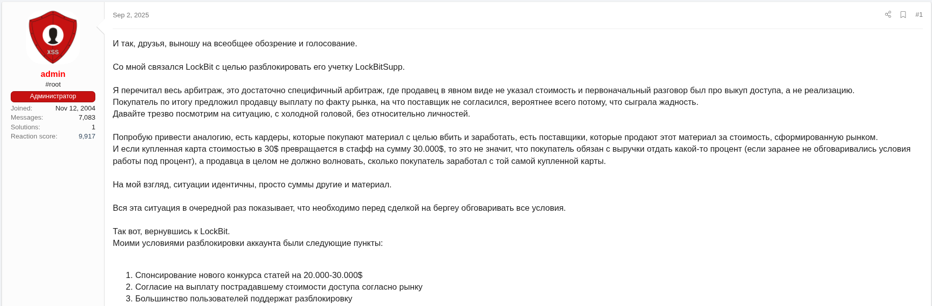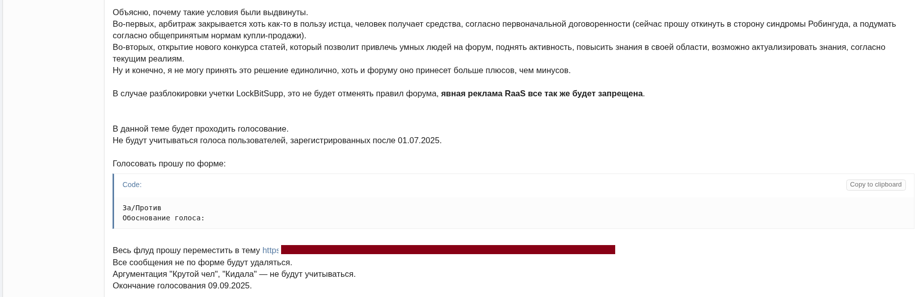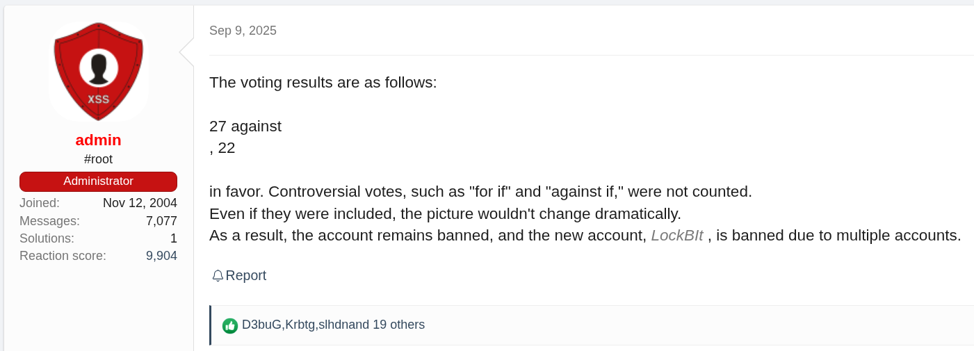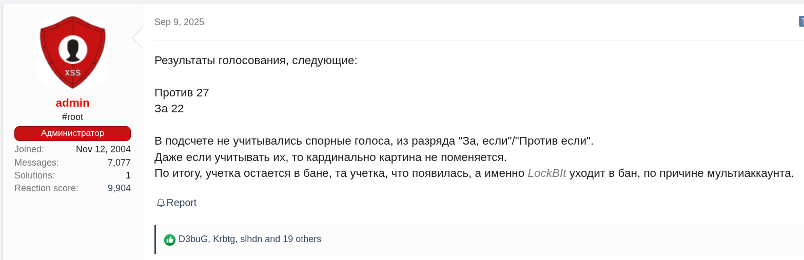 In the context of LockBit’s apparent and progressive loss of public and operational relevance, it is worth noting that on September 2, 2025, approximately two weeks prior to the alliance announcement, the administrator of the XSS forum launched a poll directed at the criminal community to gather feedback on the possible removal of the ban imposed on the LockBitSupp account.[15]. The vote, which remained open until September 9, 2025, resulted in a decision against reinstating the profile.
