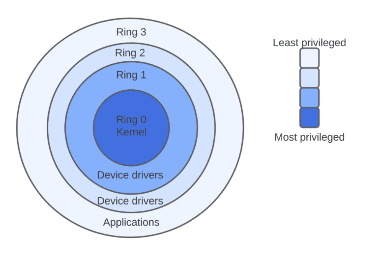 Privilege rings in processor architecture: Ring 0 (kernel mode) provides the highest privilege