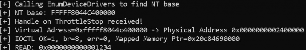 //printf("[+] IOCTL OK=%d, br=%lu, err=%lu, Mapped Memory Ptr=0x%llx\n", ok, br, GetLastError(), (unsigned long long)out);