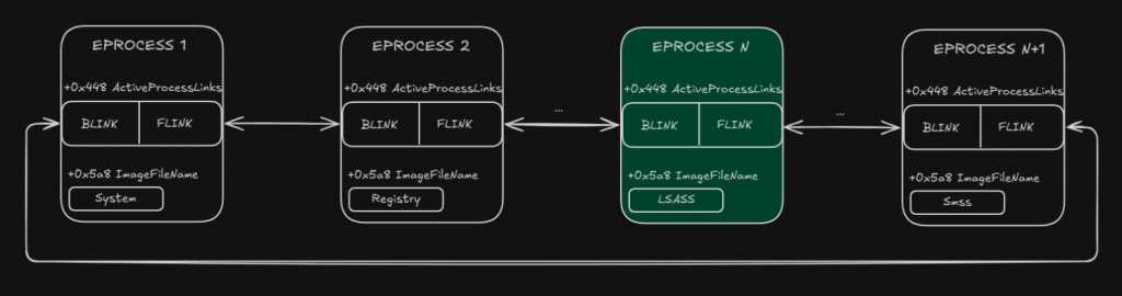From each EPROCESS structure, the ImageFileName (or PID) is checked and the list is traversed using the Flink/Blink fields until the LSASS EPROCESS is found. It can be seen in the following code snippet: