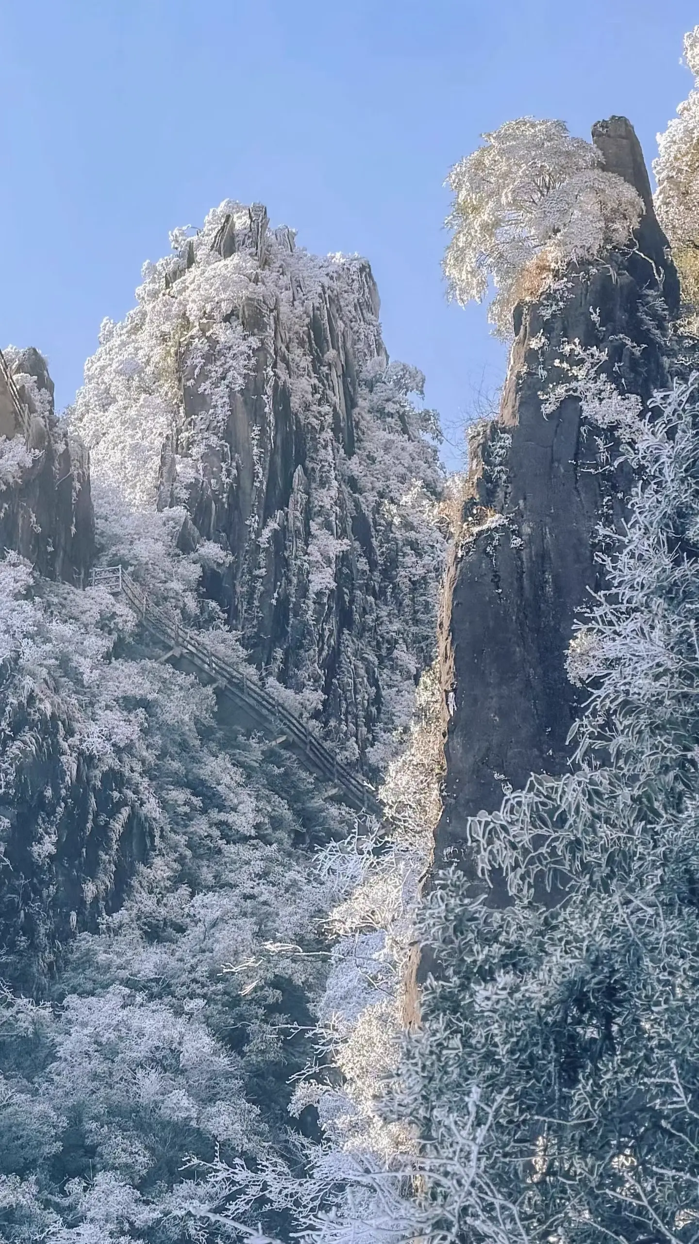 在山上能看到险峻的高山、大片的白雾、云海和雾凇。因为雾凇,植物都披了一层白色的外衣,蛮好看的。在有阳光的地方,雾凇透明闪亮,融化了也会不断掉落,像是下冰雹。