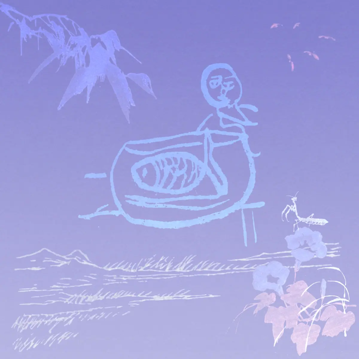 专辑封面能看到一只鱼塞满了鱼缸、一个站在鱼缸边上的人、山、风吹过的草地、螳螂、烟花、牵牛花(?),还有左上角我不了解的植物,蓝紫色的背景给人夜晚的感觉。