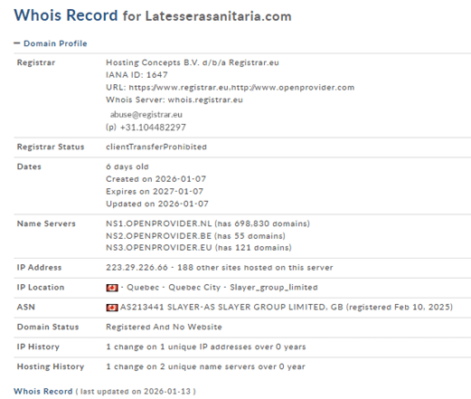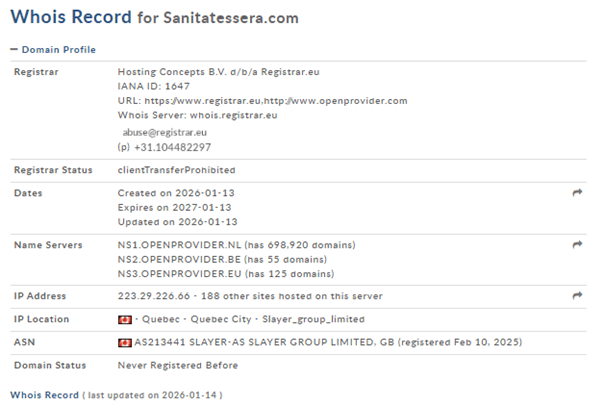 Si tratta di un sito ospitato su un dominio di recente registrazione (https://latesserasanitaria[.]com) che non ha alcun legame con il dominio della pubblica amministrazione. Anche la presenza di un certificato TLS non è garanzia di legittimità, ma solo usato come ulteriore elemento di rassicurazione per la vittima.