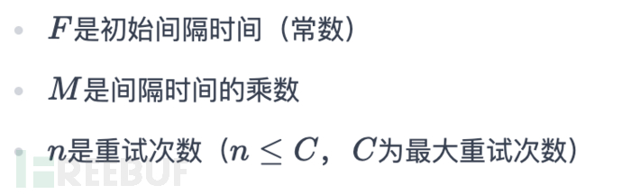 该策略以三个核心参数为基础:首次重试间隔时间 F、重试间隔乘数 M 和最大重试次数 C。