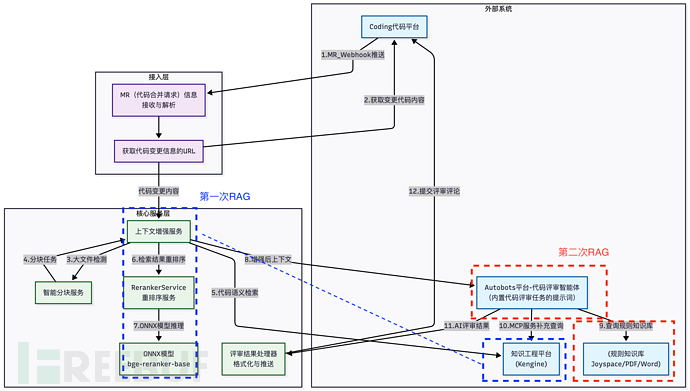 核心技术路径: 在通过公共流程(Webhook触发、解析MR、获取Diff)得到代码变更内容后,该方案的核心处理流程如下: