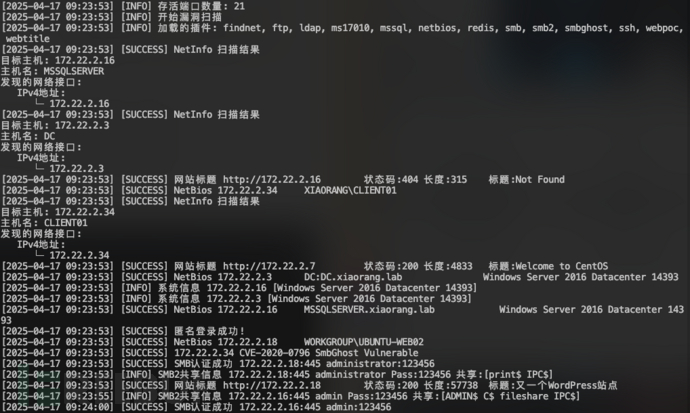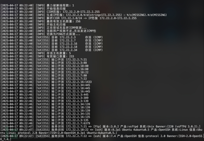 使用fscan扫描172.22.2.0/24网络:./fscan -h 172.22.2.0/24