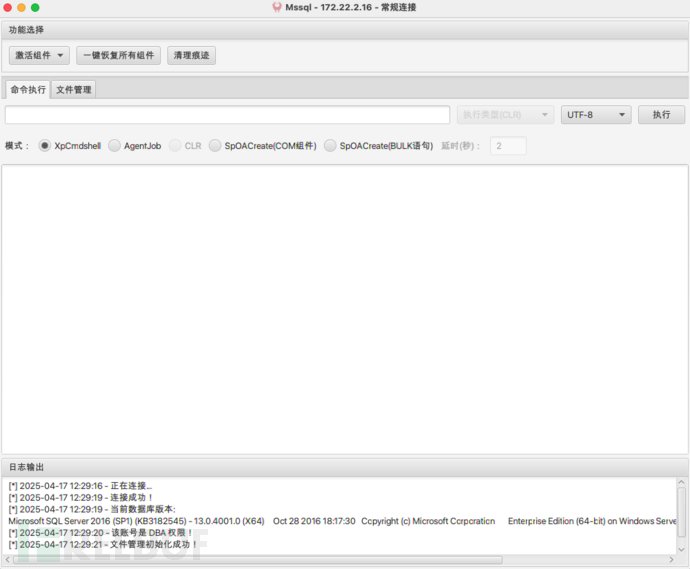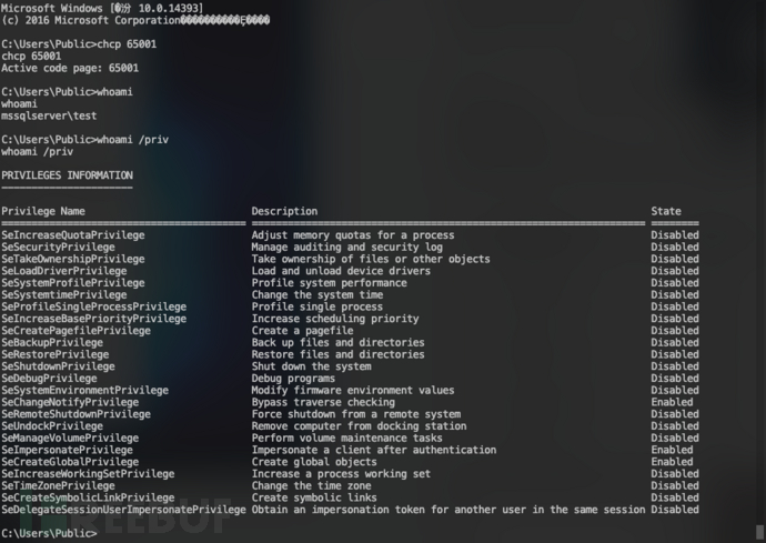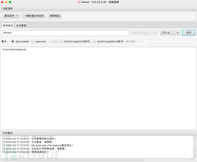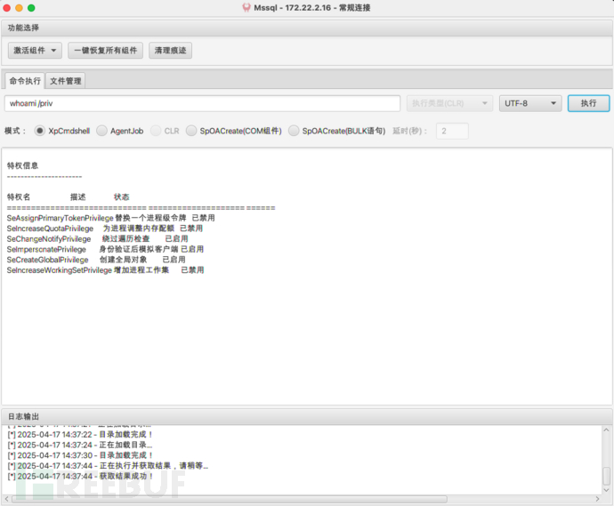 先激活Ole Automation Procedures组件,执行命令whoami查看权限