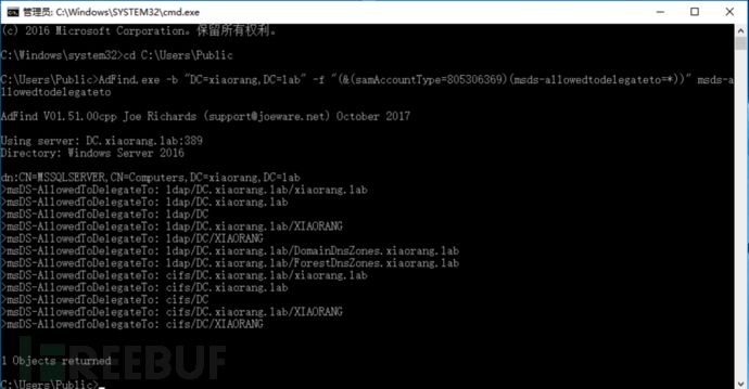 查询域内主机委派:AdFind.exe -b "DC=xiaorang,DC=lab" -f "(&(samAccountType=805306369)(msds-allowedtodelegateto=*))" msds-allowedtodelegateto