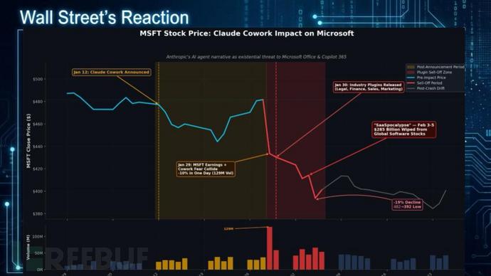 华尔街对Claude Cowork的反应堪比当年ChatGPT问世时的震荡。图表显示,微软财报后股价下跌主要源于两个担忧: