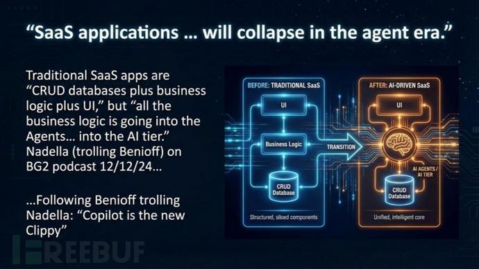 传统SaaS三层架构(CRUD数据库+业务逻辑层+用户界面)正在Agent时代重构。纳德拉最初描绘的愿景是:业务逻辑和工作流将迁移至Agent层,SaaS应用退化为数据与权限管理模块。
