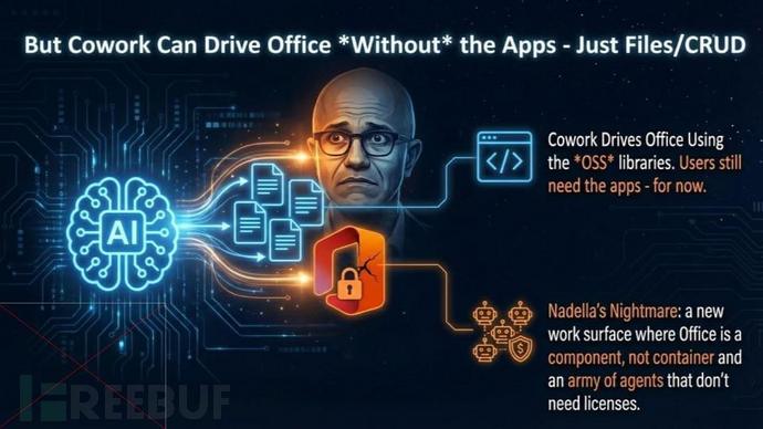 但Claude Cowork的实践表明:Agent可以直接操作Office文件底层数据结构,完全绕过应用程序界面。这使微软设想的"Agent军团授权模式"面临根本性质疑。