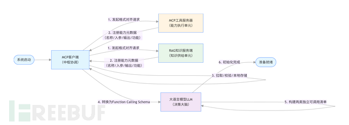 1.3,能力数据处理与格式转换:MCP 客户端完成对 MCP 工具服务器、RAG 知识服务端注册能力数据的拉取、合法性校验与本地持久化存储;并将两类独立服务的能力数据,统一转换为 LLM 可识别的标准化 Function Calling Schema 格式,完成能力元数据的封装后同步至 LLM。