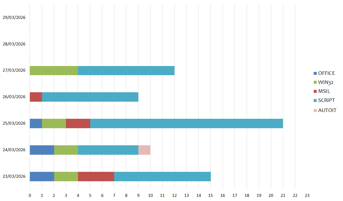 Instead in this graph we see the distribution based on malware family. In the past week 10 different families were detected: