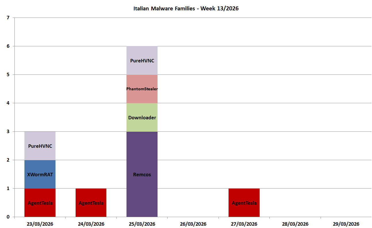 In this graph we can see the malware families spread during the week with target Italy (in Italian) and composed of 6 families: