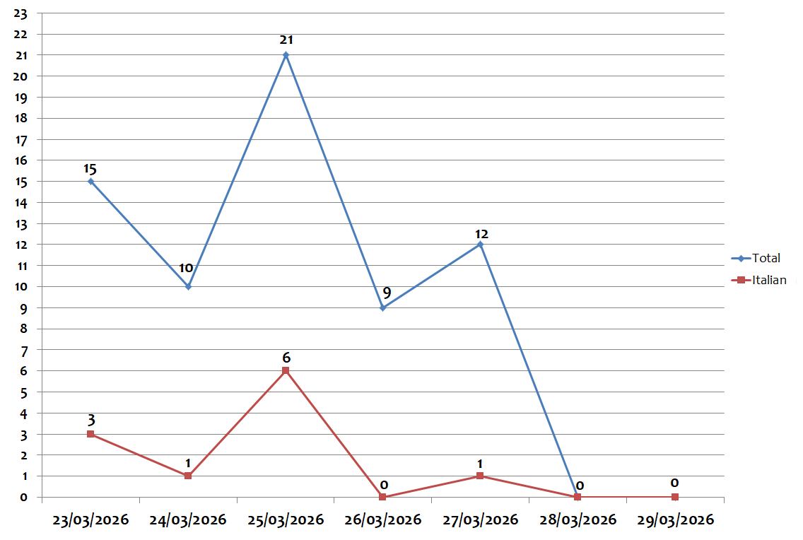 During the week, the peak in global campaigns was recorded on Wednesday 25 March, with 21 different campaigns per day. The peak in campaigns in Italian was recorded on Wednesday 25 March, with 6 different campaigns per day, as shown in the graph below: