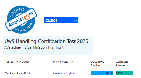 TG Soft è lieta di annunciare che Vir.IT eXplorer PRO ha superato l'ultimo test rilasciato da AppEsteem, effettuato a Febbraio 2026 ottenendo il massimo risultato al test per gli AV DeceptorFighters.